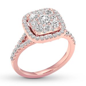 For an everlasting love, never-ending sparkle. Awash in round diamonds, this extraordinary engagement ring is crafted of 14K rose gold. The ring has a total diamond weight of 3/4 carat.