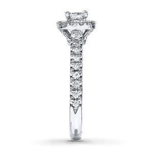 A princess-cut diamond takes center stage in this dramatic engagement ring for her from the Neil Lane Bridal collection. A supporting cast of round diamonds frames the center and lines the band of 14K white gold for a design worthy of applause. The ring has a total diamond weight of 7/8 carat.