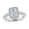 This wonderful engagement ring effortlessly combines vintage and contemporary styles. The sparkling emerald-cut center brings an instant Art Deco look, while shimmering halos of round diamonds add modern flair. The 14K white gold ring has a total diamond weight of 1/2 carat. From the Now & Forever Bridal Collection.