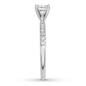 This timeless engagement ring is graced with a sparkling 5/8-carat round diamond center. More diamonds glisten along the band to complement, bringing the total diamond weight to 3/4 carat. The ring is fashioned in 14K white gold.